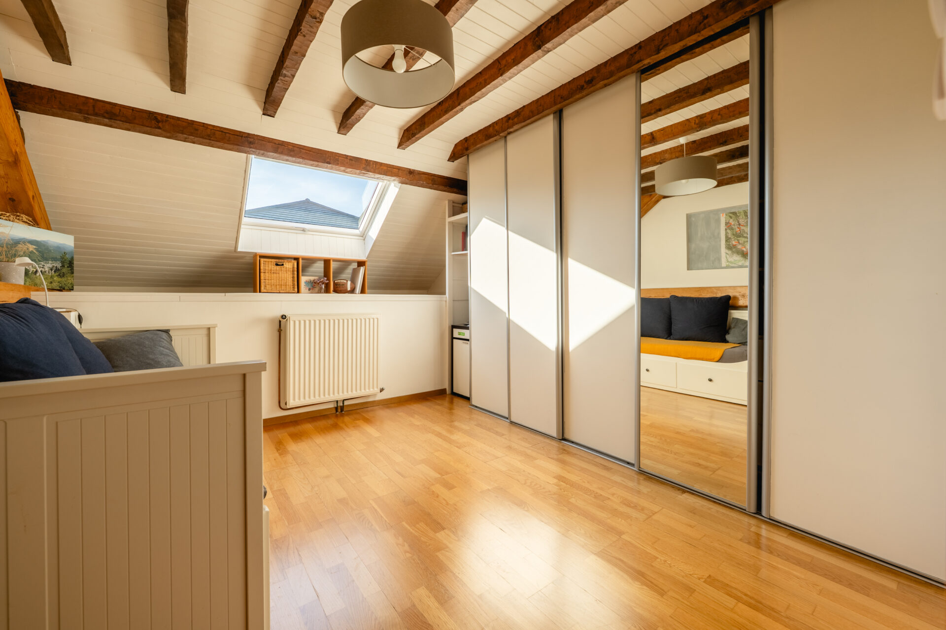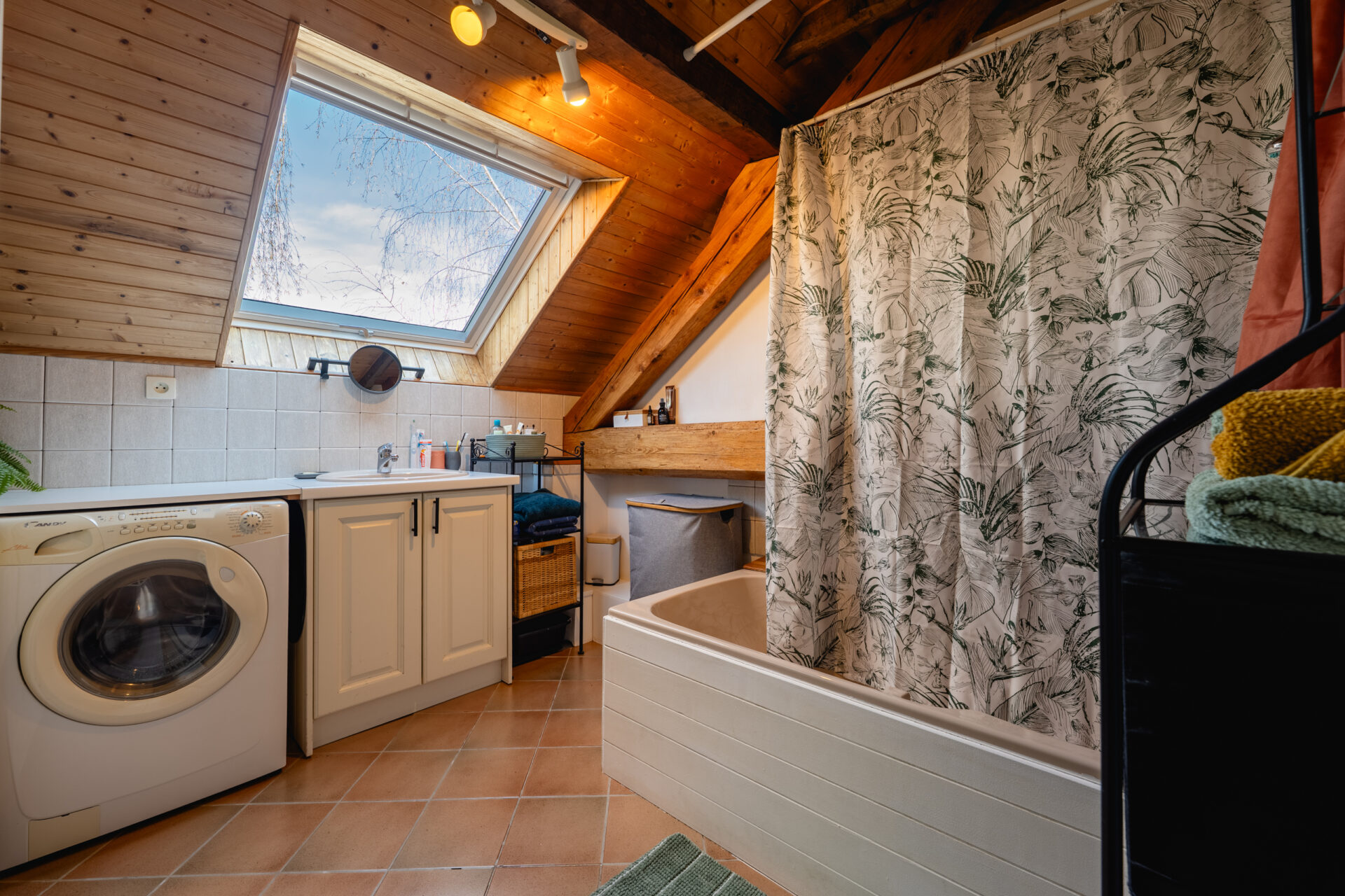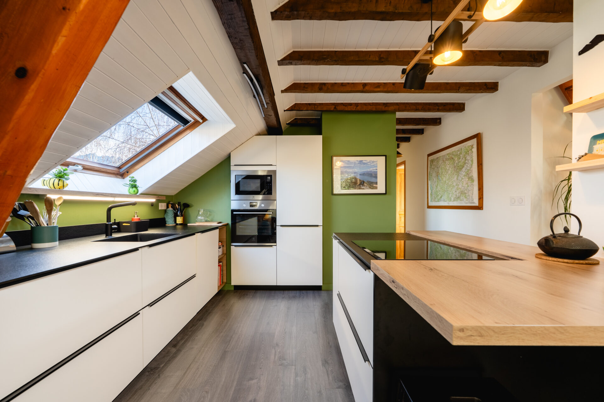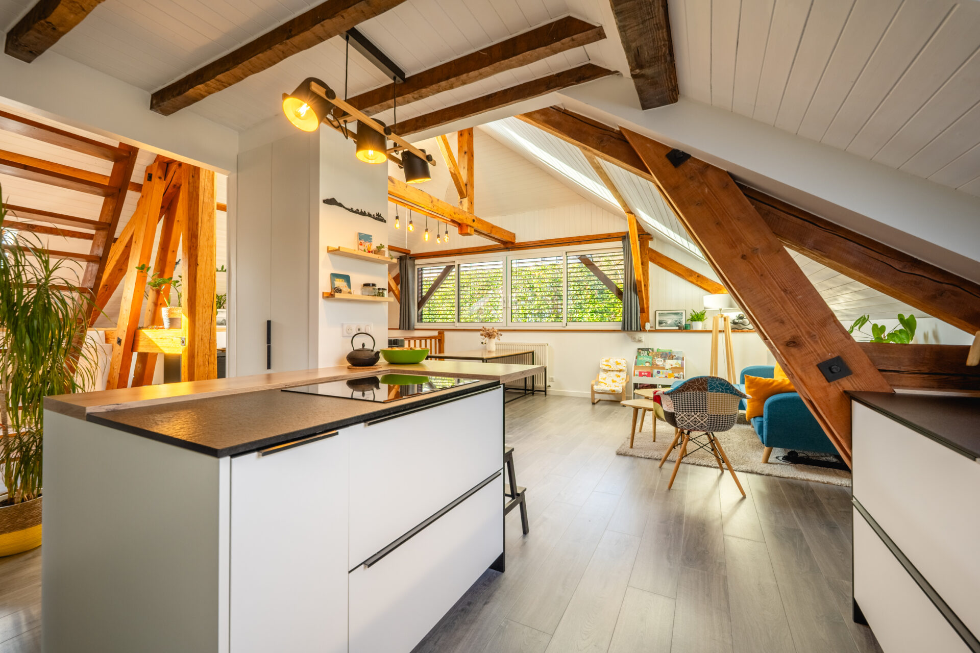 À l’étage, la pièce de vie séduit immédiatement par sa luminosité, sa belle hauteur sous plafond et ses poutres apparentes. Elle se compose d’une cuisine aménagée et équipée ouverte sur le salon/séjour, prolongée par une mezzanine, idéale pour un espace bureau ou un coin nuit.