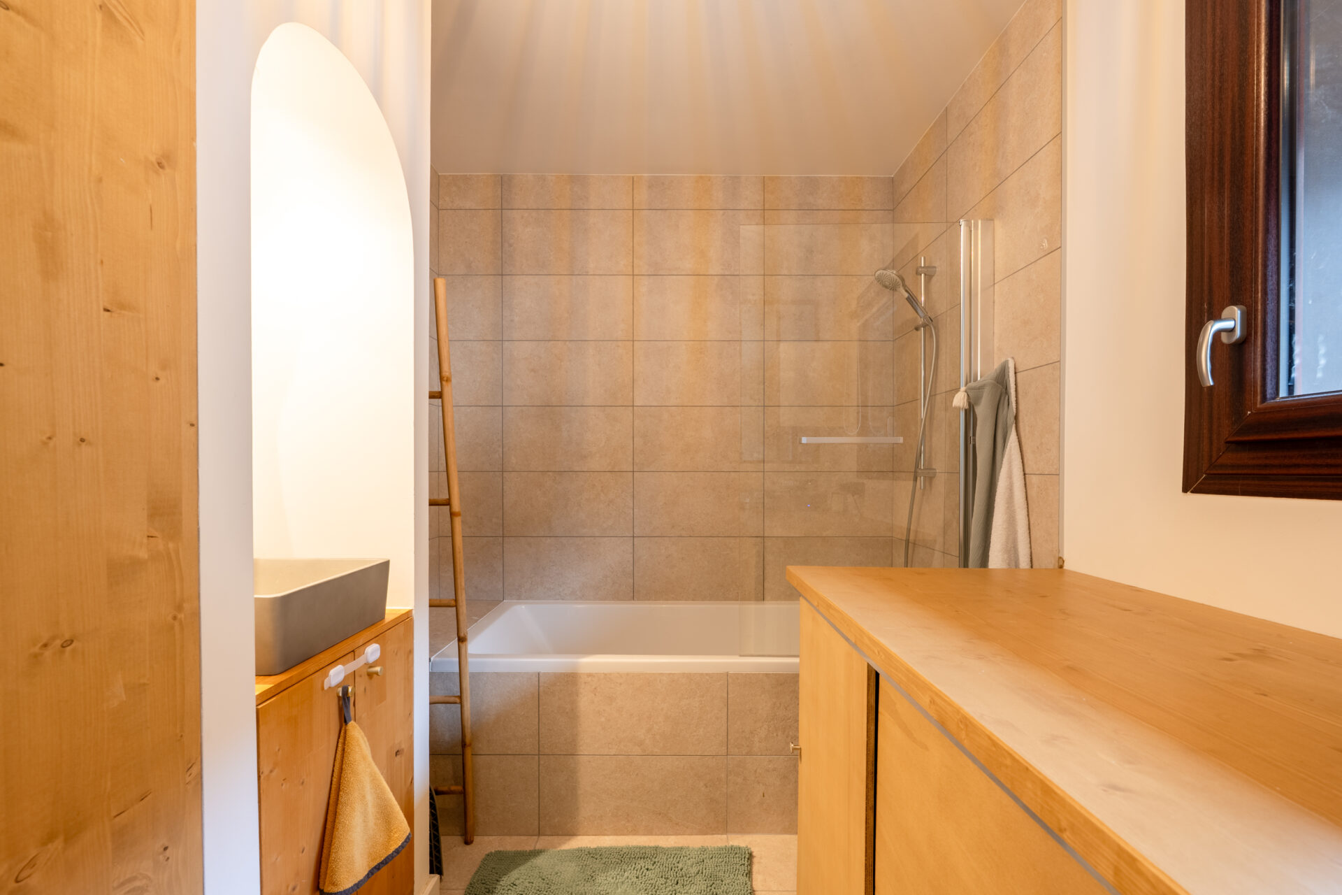 Il comprend, au premier niveau, une entrée avec placard, une cuisine aménagée et équipée ouverte sur un salon/séjour donnant accès à une terrasse d’environ 17 m², offrant une superbe vue sur le lac et les montagnes environnantes. Une chambre avec salle de bains ainsi qu’un WC séparé complètent ce niveau.