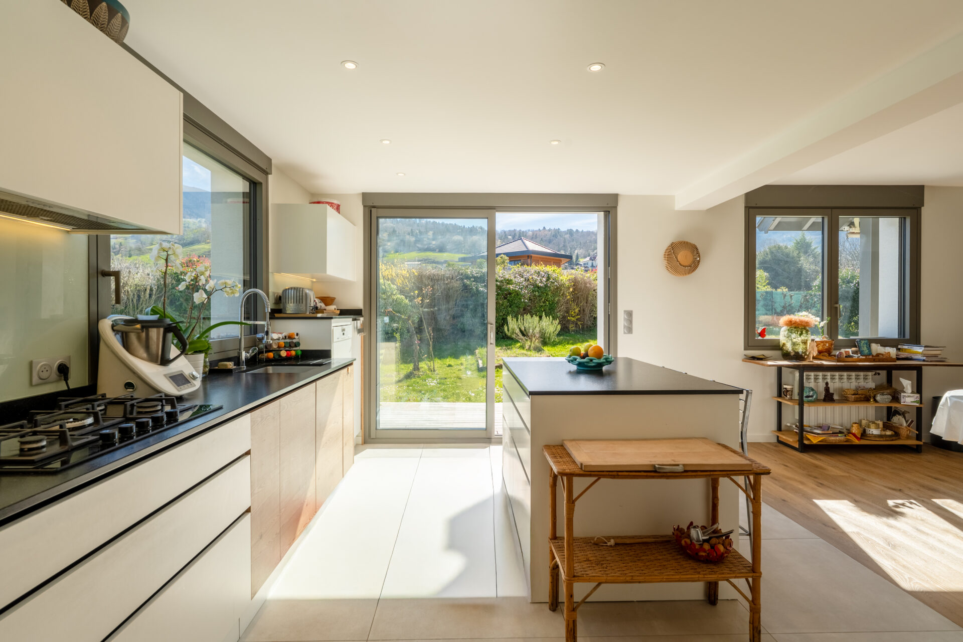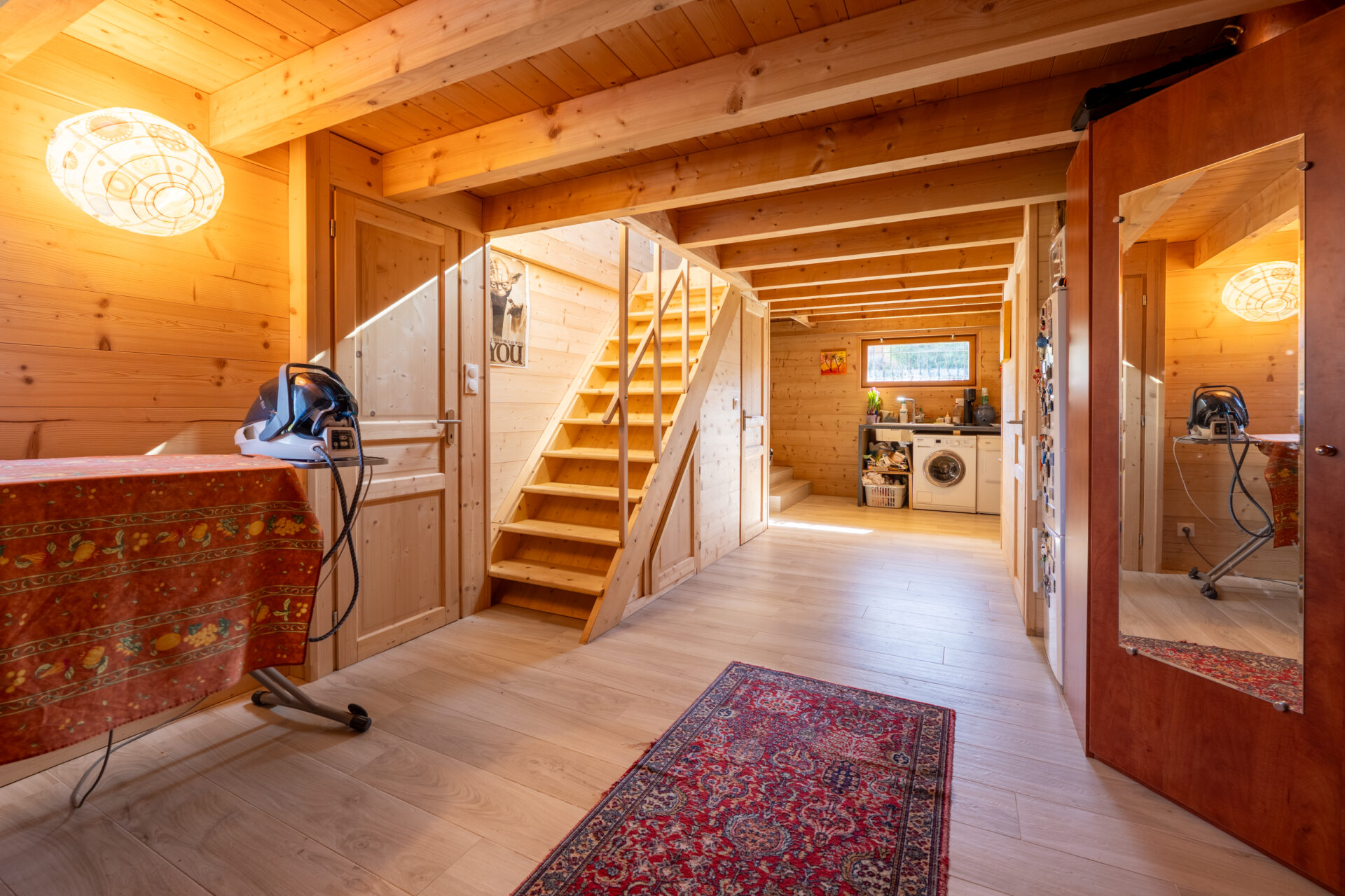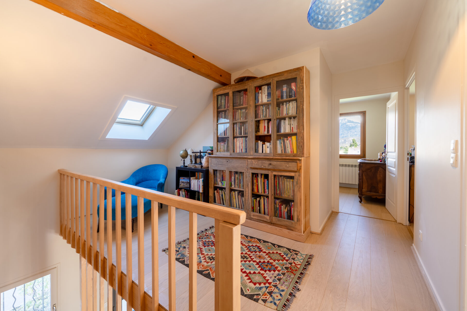 Au rez-de-chaussée, une spacieuse entrée mène à une superbe pièce de vie de 52 m², baignée de lumière grâce à ses nombreuses baies vitrées. Celle-ci s’ouvre sur une terrasse exposée sud-est offrant une vue dégagée sur les montagnes. Vous trouverez également une chambre avec salle d’eau, un bureau ainsi qu’un WC indépendant.
