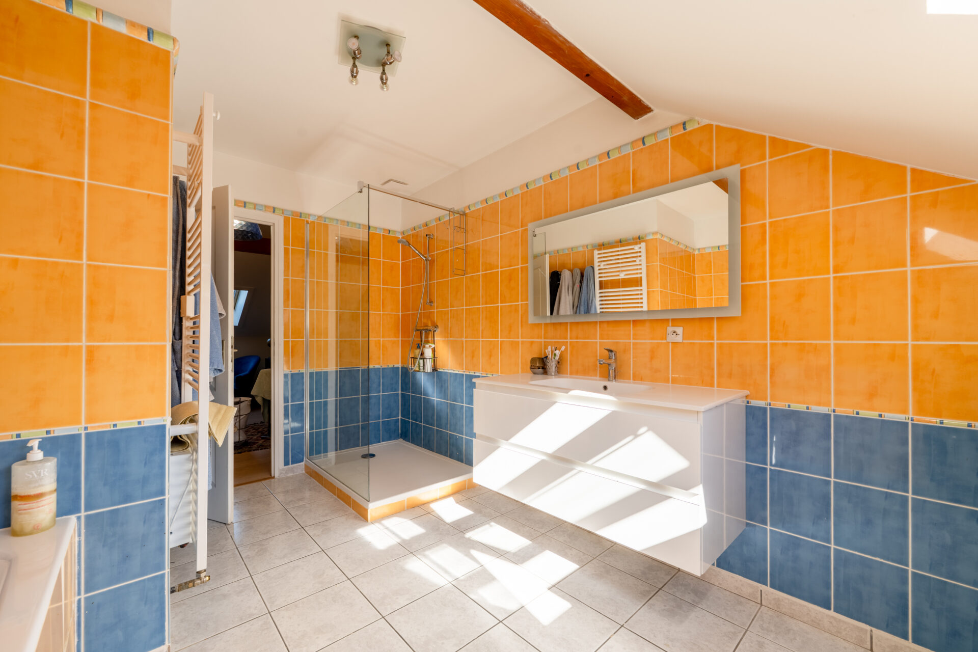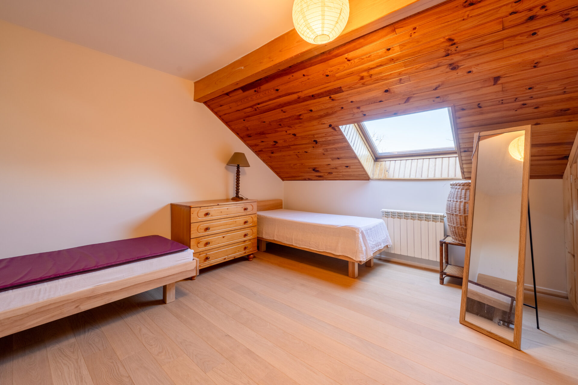 À l’étage, l’espace nuit se compose de quatre chambres, dont deux avec placards, ainsi qu’une salle de bains équipée d’une douche et d’une baignoire, et un WC séparé.