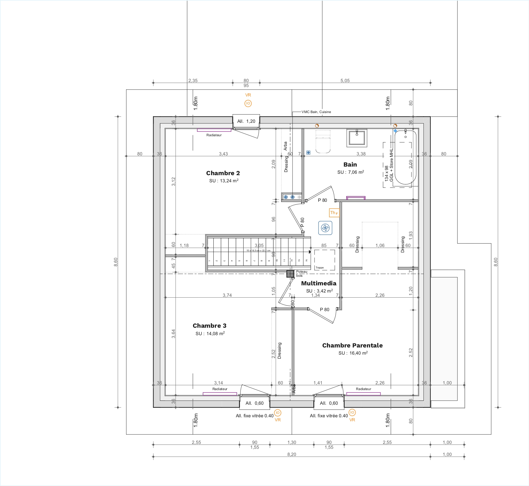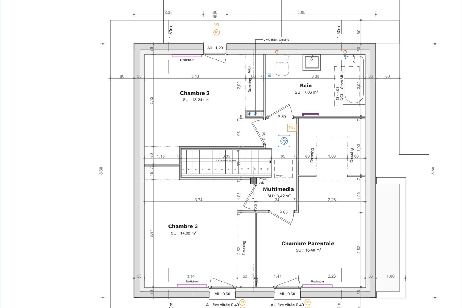 Chauffage économique par pompe à chaleur avec plancher chauffant au rez-de-chaussée + radiateurs à l’étage.