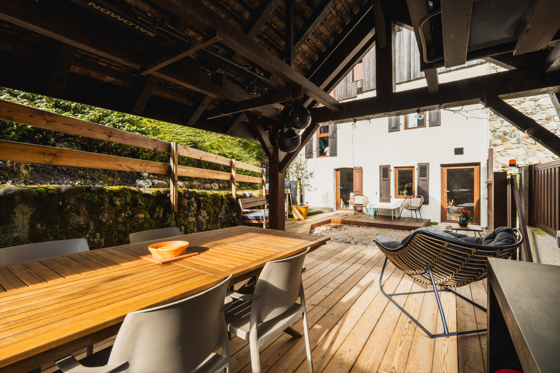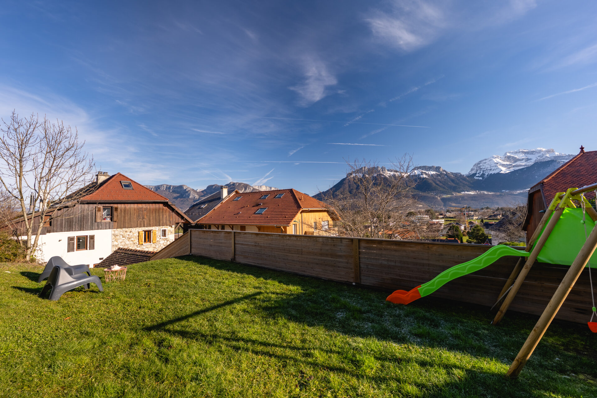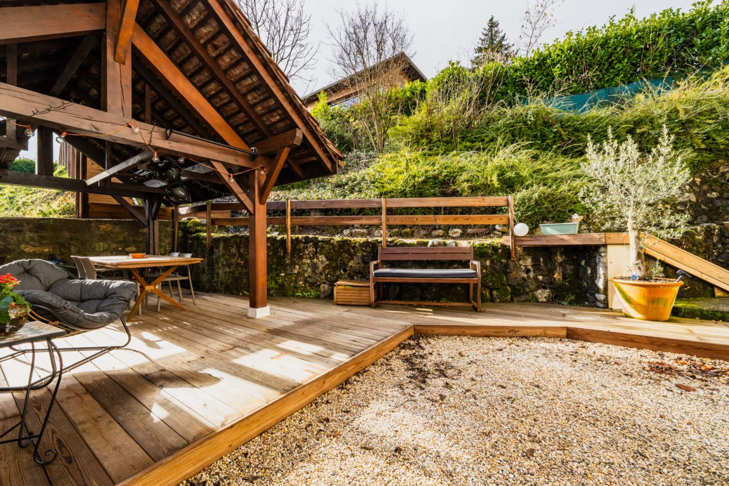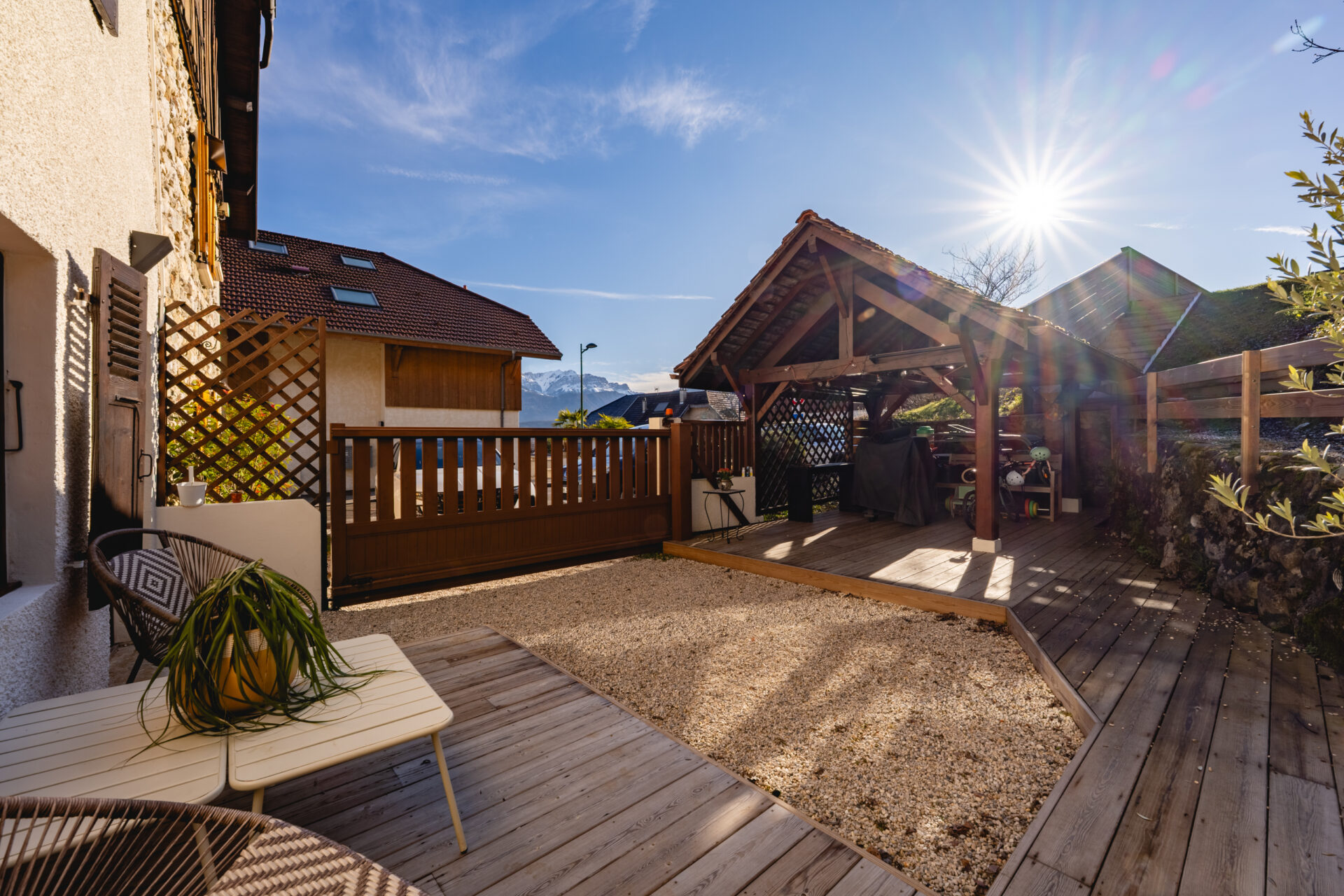Aux beaux jours, vous profiterez pleinement d’une agréable terrasse en bois exposée plein sud, ainsi que d’un jardin clos offrant une vue imprenable sur les montagnes.