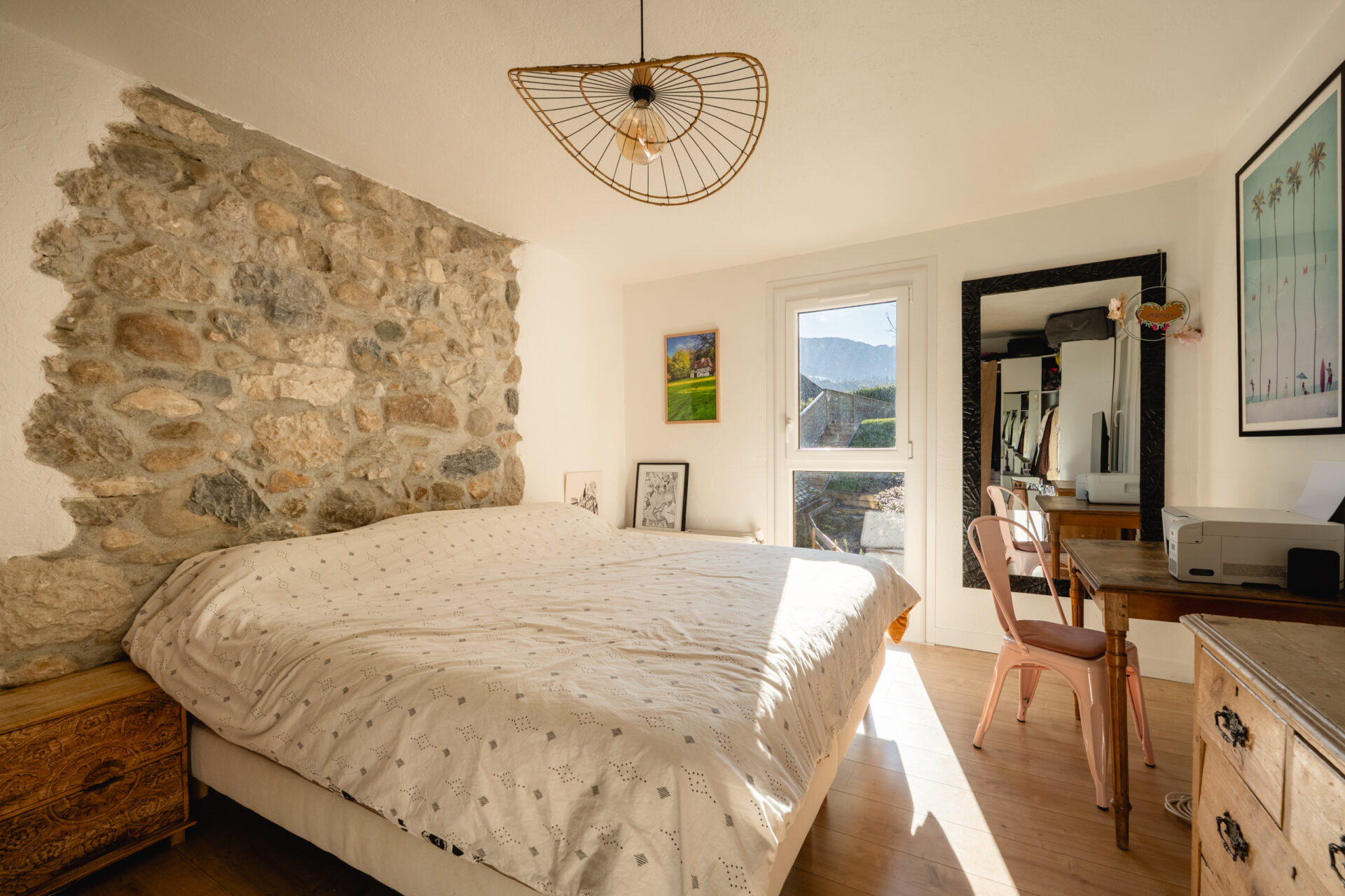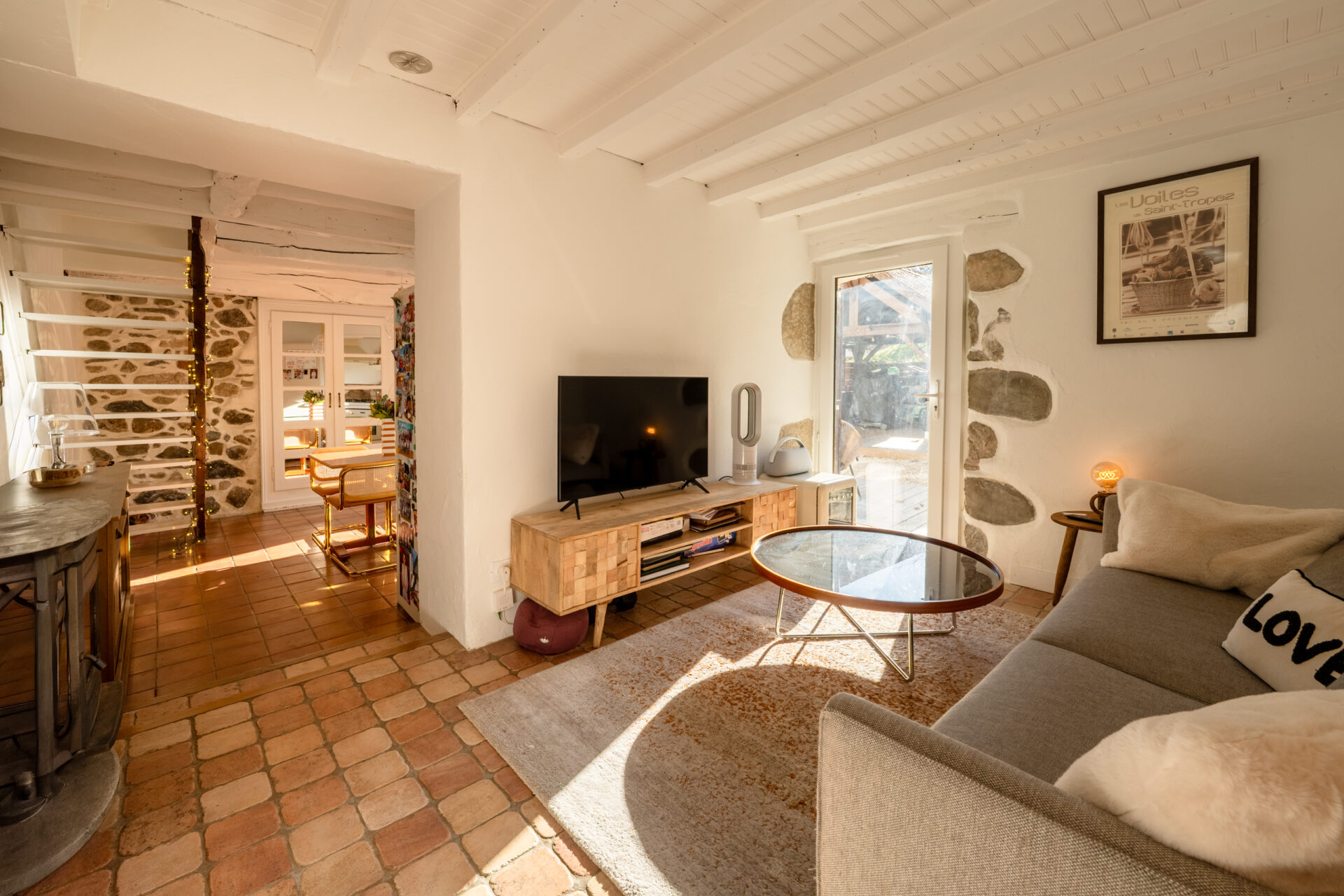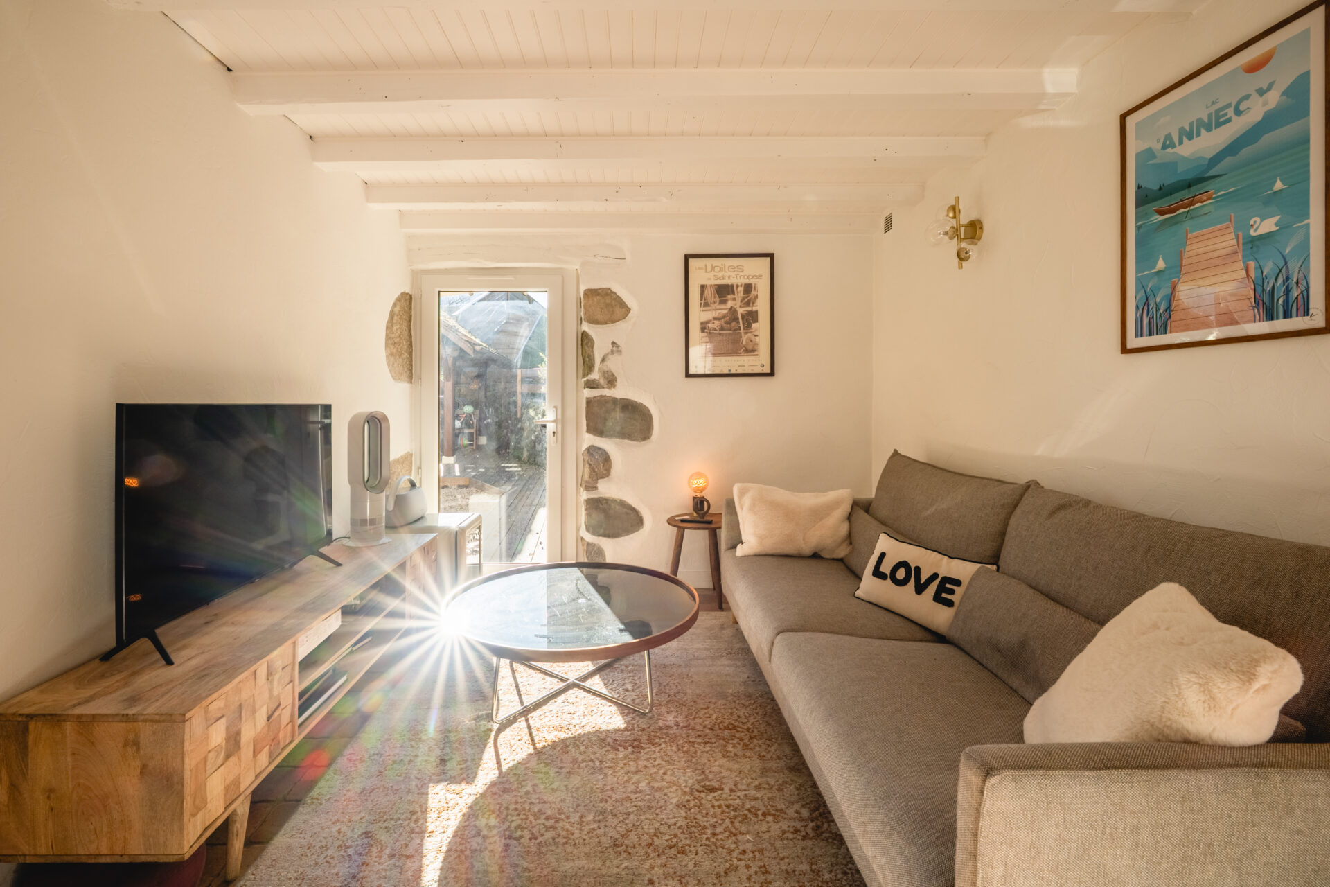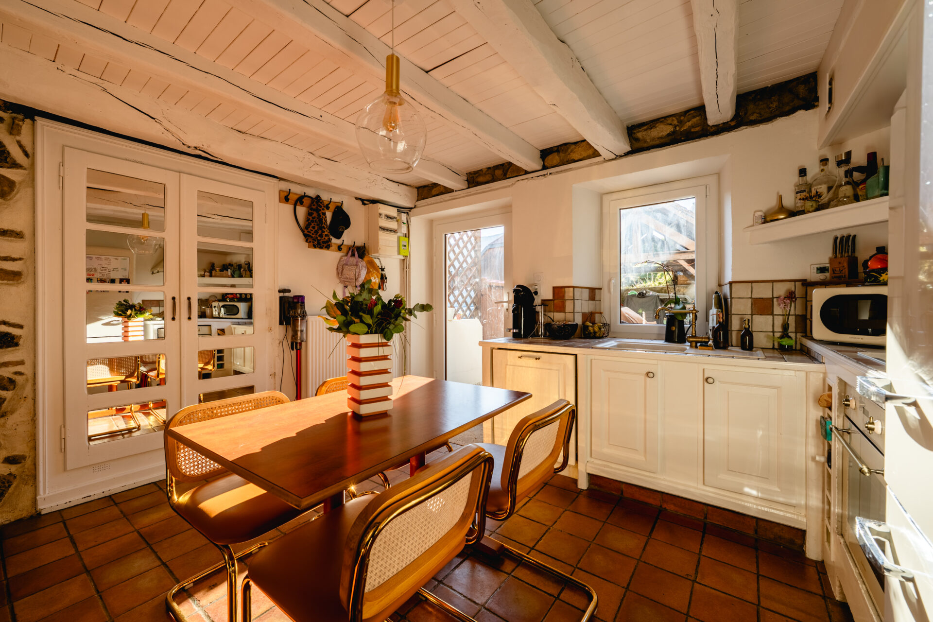 La maison se compose d’une cuisine équipée et aménagée, ouverte sur un salon lumineux. Le charme de l’ancien opère immédiatement grâce aux pierres apparentes, et lors des journées plus fraîches, le poêle à bois apporte une atmosphère chaleureuse et conviviale.