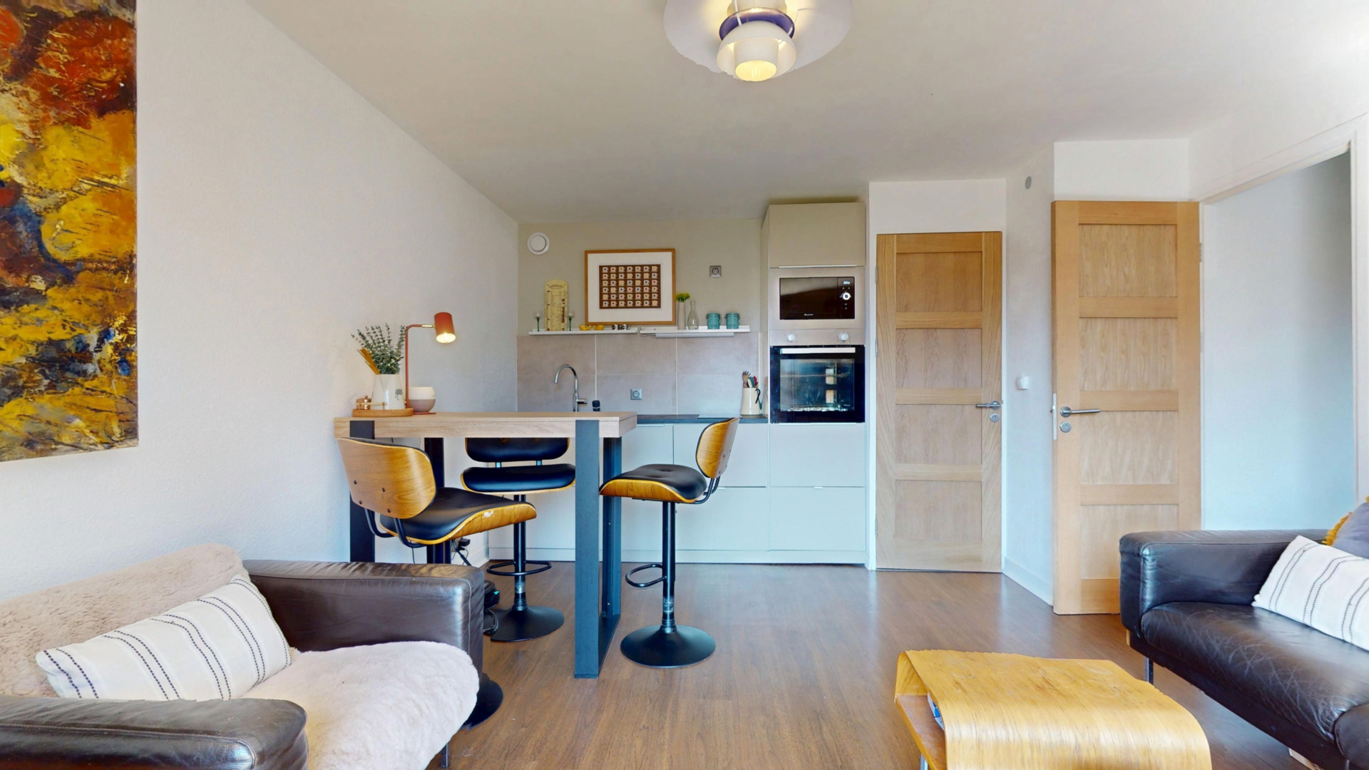 L’appartement se compose d’une entrée avec dressing, d’un cellier pratique pour le rangement, ainsi que d’une cuisine aménagée et équipée ouverte sur un séjour lumineux. Celui-ci s’ouvre sur un agréable balcon de 5,26 m² offrant une superbe vue sur les montagnes environnantes.