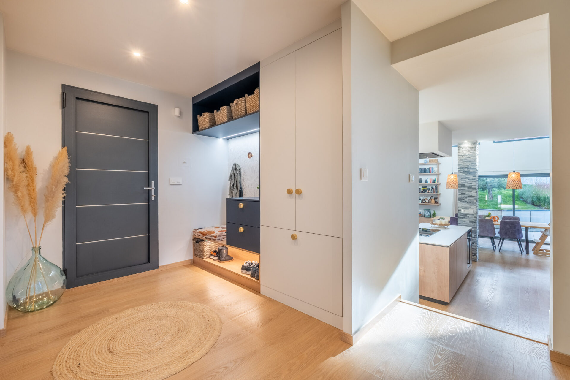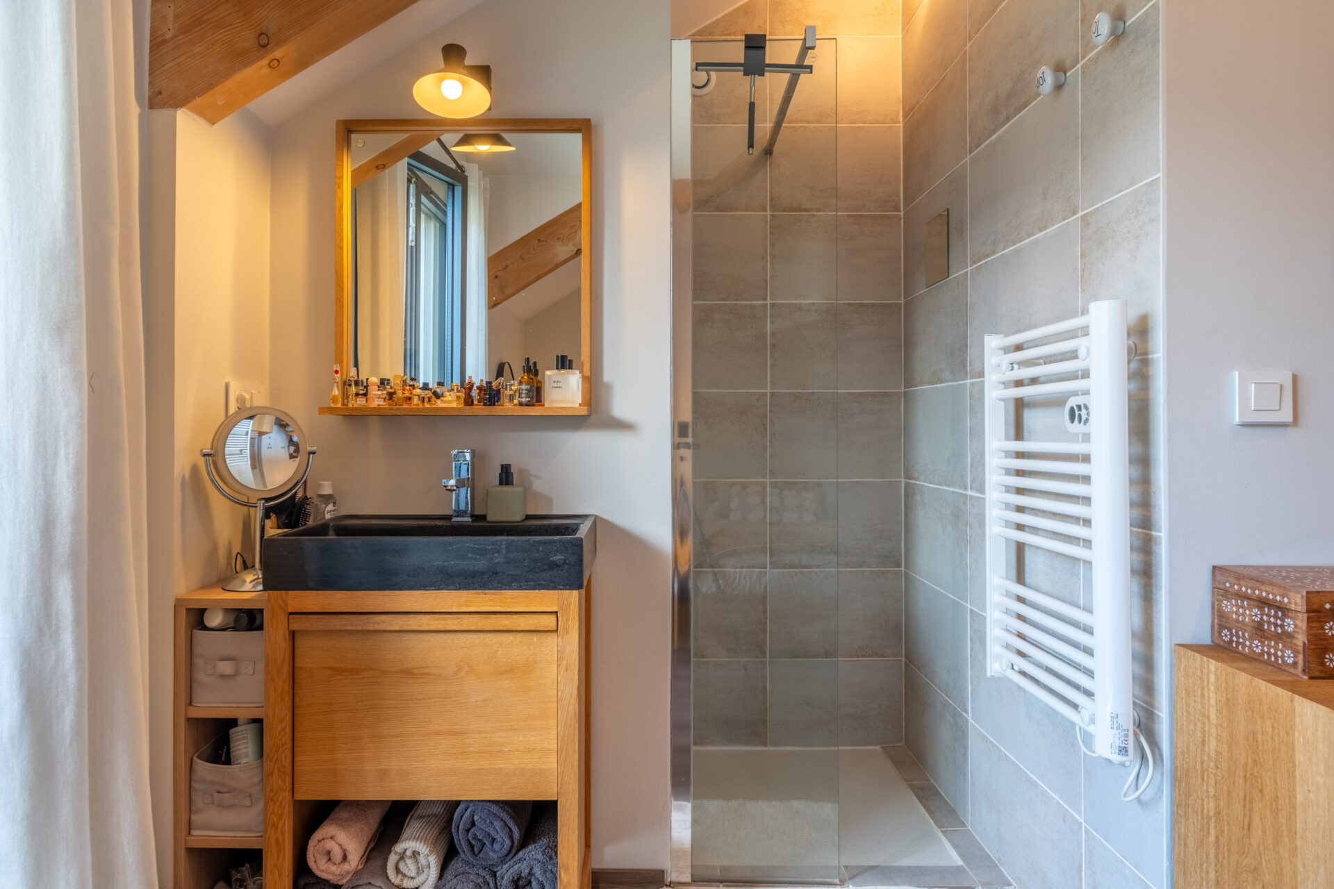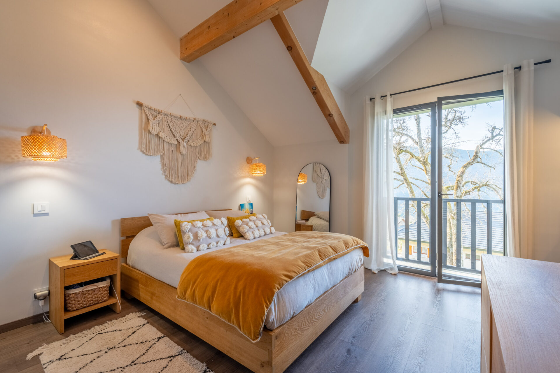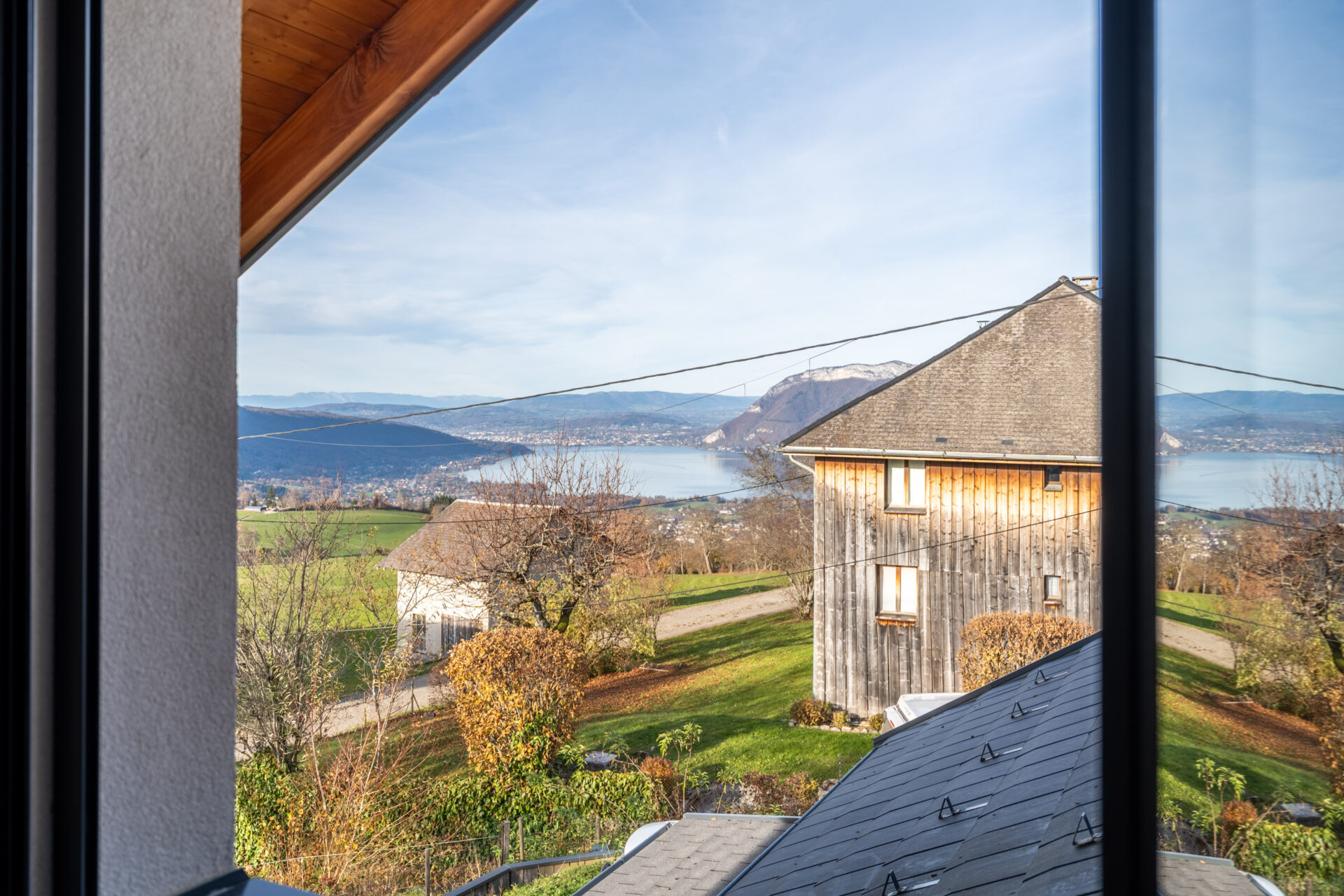 À l’étage, une seconde suite parentale avec salle d’eau, trois chambres avec dressings sur mesure – dont une avec vue lac – ainsi qu’une salle de bains et un WC séparé.