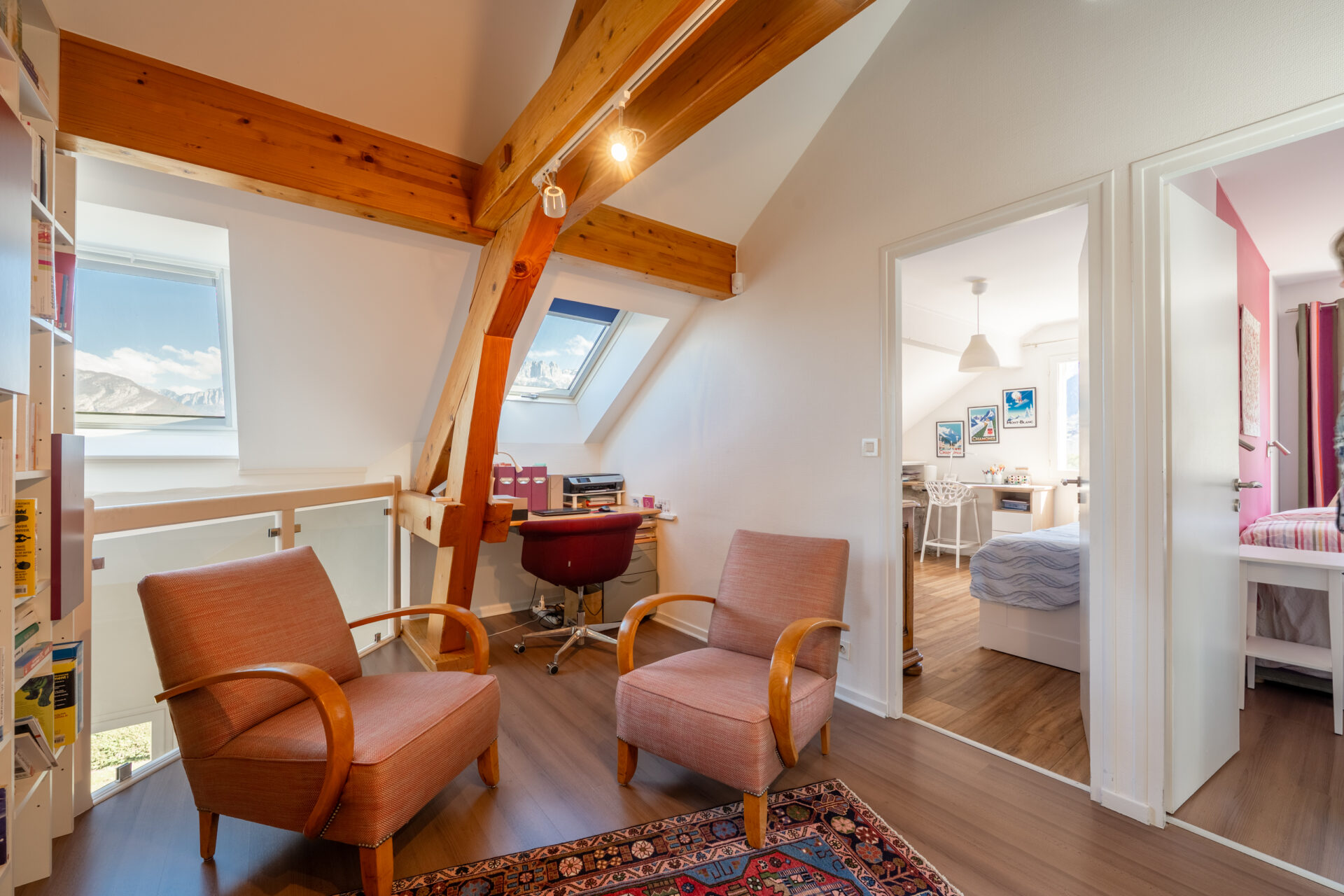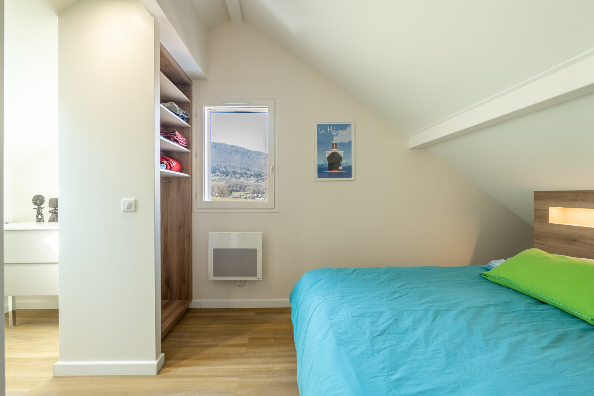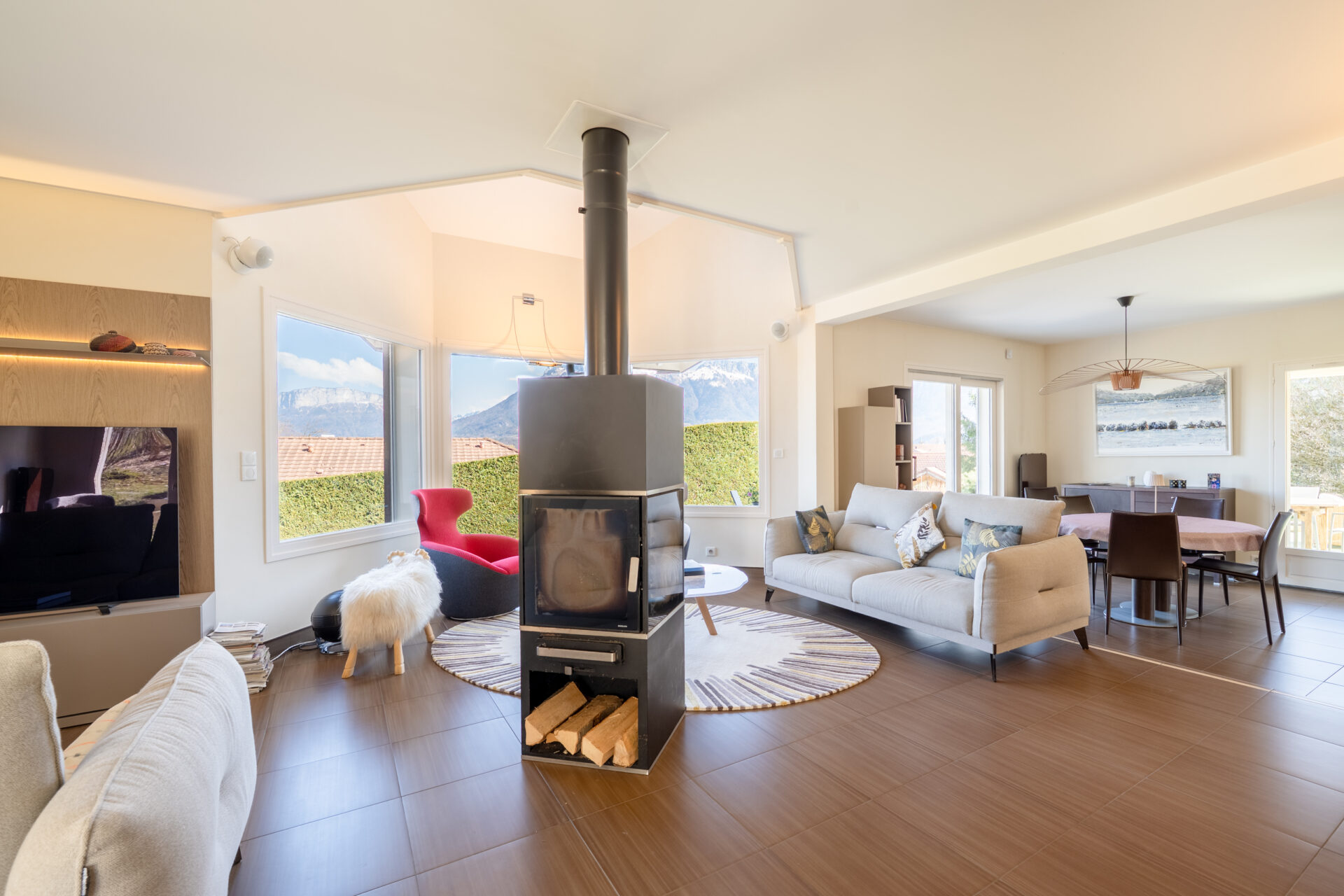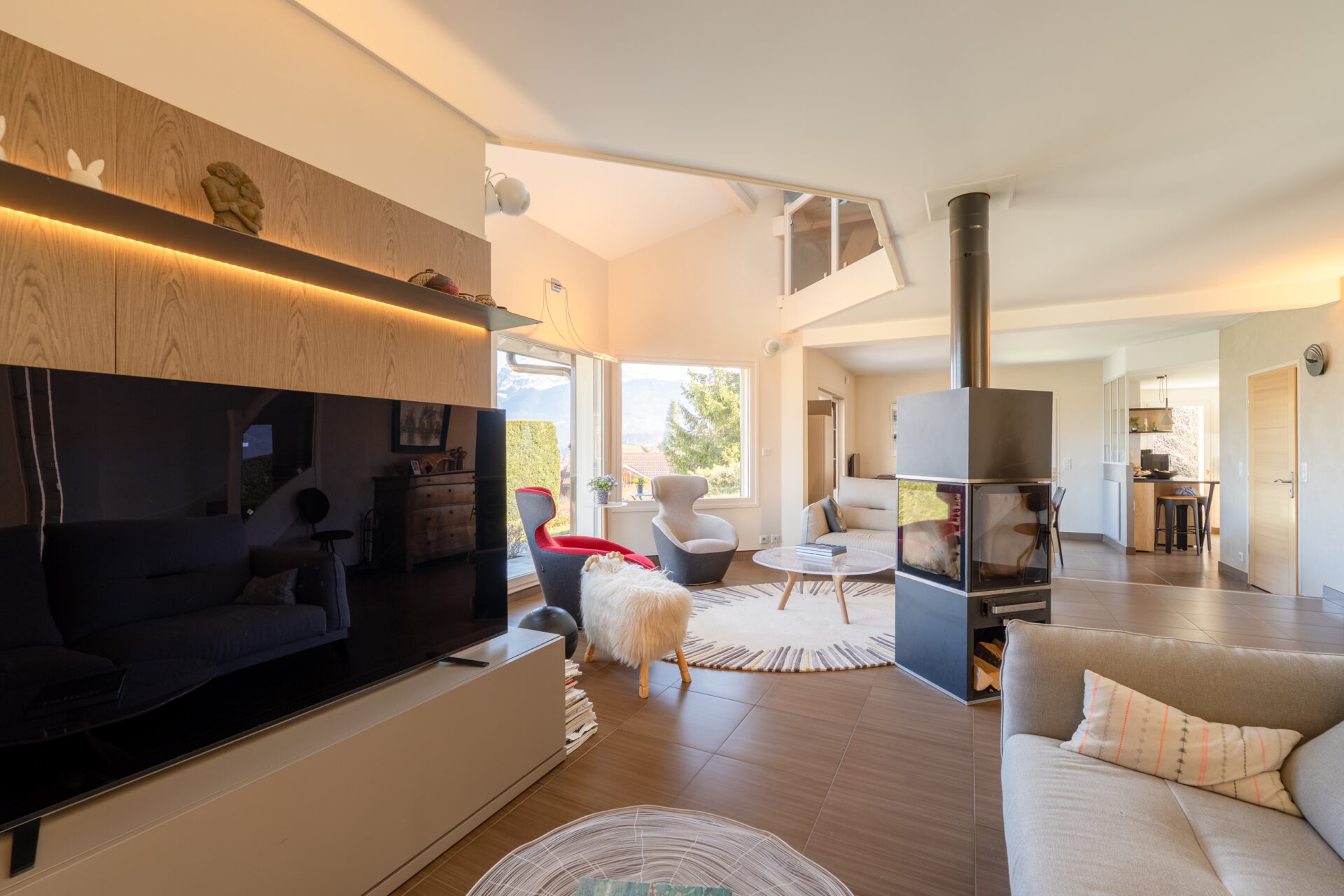 Dès l’entrée, vous serez séduits par une vaste pièce de vie de 51 m², baignée de lumière grâce à sa triple exposition Est / Sud / Ouest. Les larges ouvertures dévoilent un spectacle permanent sur le lac et les montagnes.
