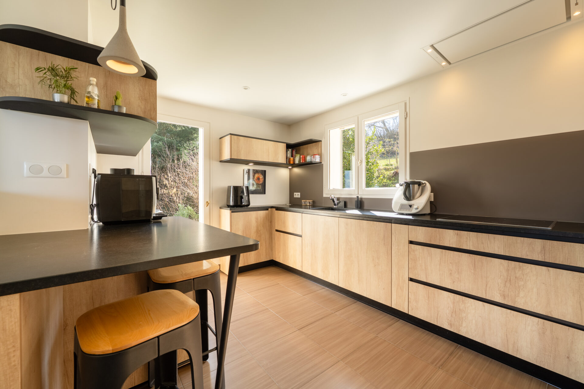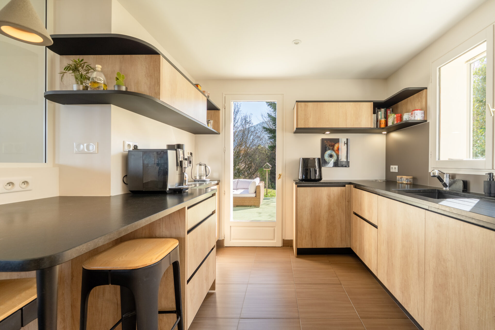 La cuisine, entièrement équipée et aménagée, est semi-ouverte sur le salon/séjour et s’ouvre directement sur la terrasse.
